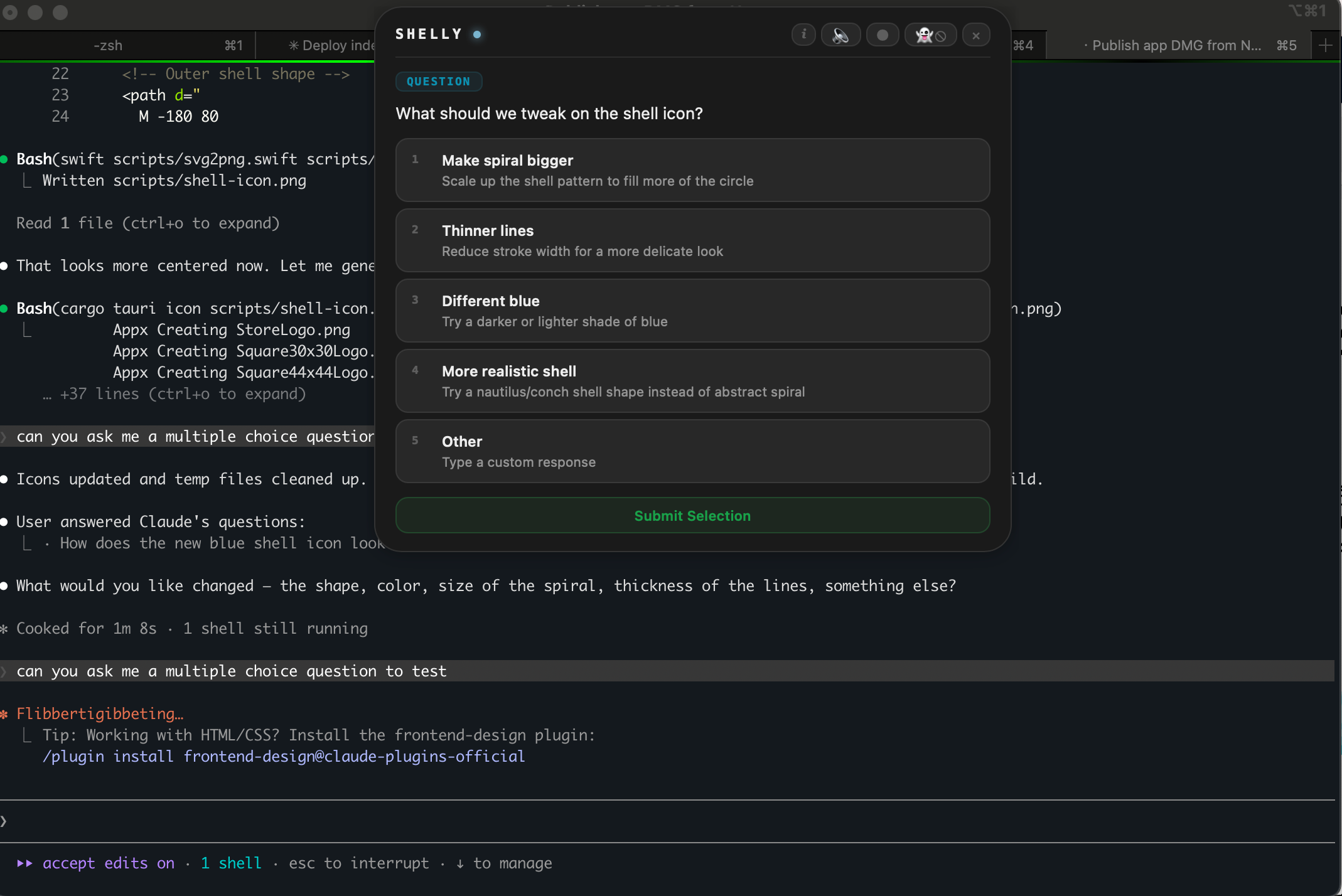 Shelly floats at the top of your screen. When Claude Code needs input, Shelly intercepts it and shows a beautiful UI.
